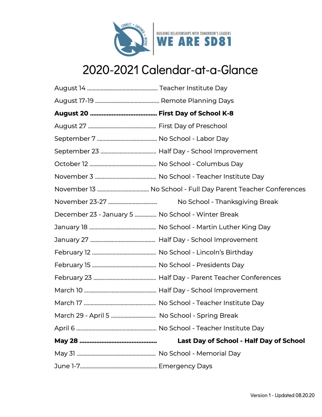 If the Schiller Park School District 81 calendar on this page is not up-to date, you can visit Schiller Park School District 81’s website at https://www.sd81.org/ for the updated version of the calendar.